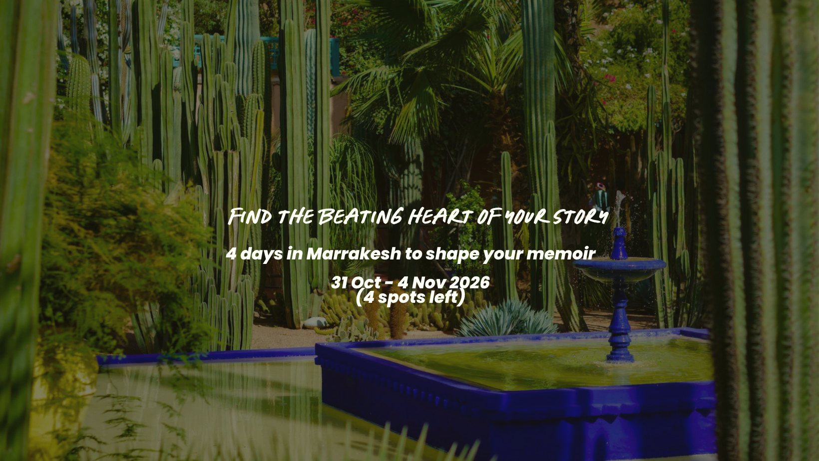 Our days will unfold with quiet mornings writing and afternoons away from laptops and notebooks - our writing needs creative fuel, and we’ll explore the souks, have a hammam and talk about storytelling in different artistic mediums with moroccan artists.
